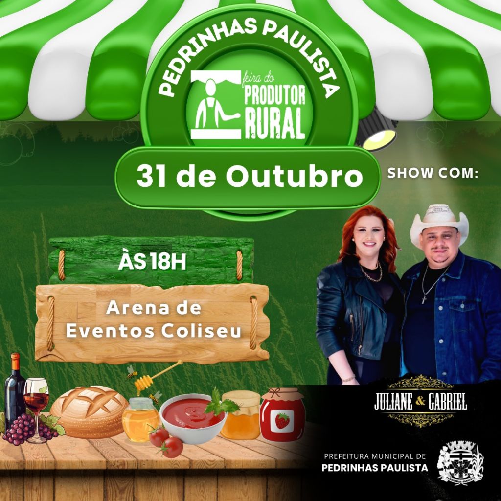 A 2º Feira do Produtor Rural de Pedrinhas Paulista acontece hoje, sexta-feira, dia 31 de outubro, a partir das 18h, na Arena Coliseu.