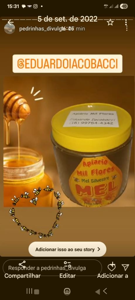 Mel Mil Flores A Mel Mil Flores oferece mel de alta qualidade, produzido de forma artesanal e extraído diretamente das colmeias locais. Comercializado em duas opções de embalagem, o produto preserva todas as características naturais: sabor marcante, aroma floral e propriedades nutritivas que fazem do mel um alimento completo e versátil. Perfeito para o consumo diário, receitas ou para quem busca produtos genuínos e de procedência confiável.